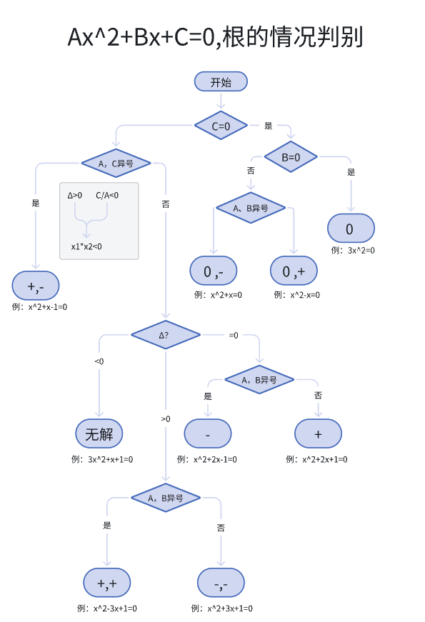 Δ口诀: Δ>0 两实根,Δ=0 重根,Δ<0 虚根